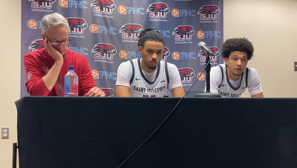 Saint Joseph's coach Steve Donahue and players Jaiden Glover-Toscano and Derek Simpson address the media after Wednesday's 68-64 win over St. Bonaventure. (Photo: Aaron Bracy)